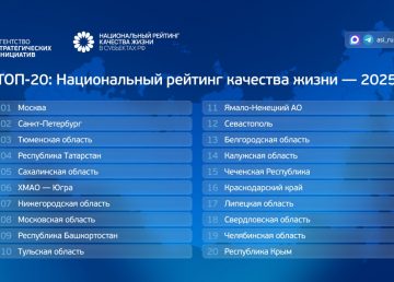 Рейтинг качества жизни – это для руководства Тюменской области не витрина, а инструмент 19.02.2026 / Тюменская область Громский АлексейВедущий аналитик Агентства политических и экономических коммуникаций (АПЭК) Тюменская область вошла в тройку регионов – лидеров Национального рейтинга качества жизни, подготовленного Агентством стратегических инициатив. Регион поднялся с четвертой строчки на третью, уступив лишь Москве и Санкт Петербургу. Рейтинг формируется на основе... »»