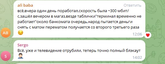 «Со значительными перебоями работают онлайн-кассы и банковские платежные терминалы. Это может привести к нарушению сроков сдачи налоговой отчетности, выплаты заработных плат, оплаты счетов контрагентам, соответственно, штрафам, пеням и неустойкам. Готовим письмо в Федеральную налоговую службу о введении моратория на начисление штрафов и пеней на период ремонта ПВОЛС», – отмечают общественники в своем Telegram-канале.