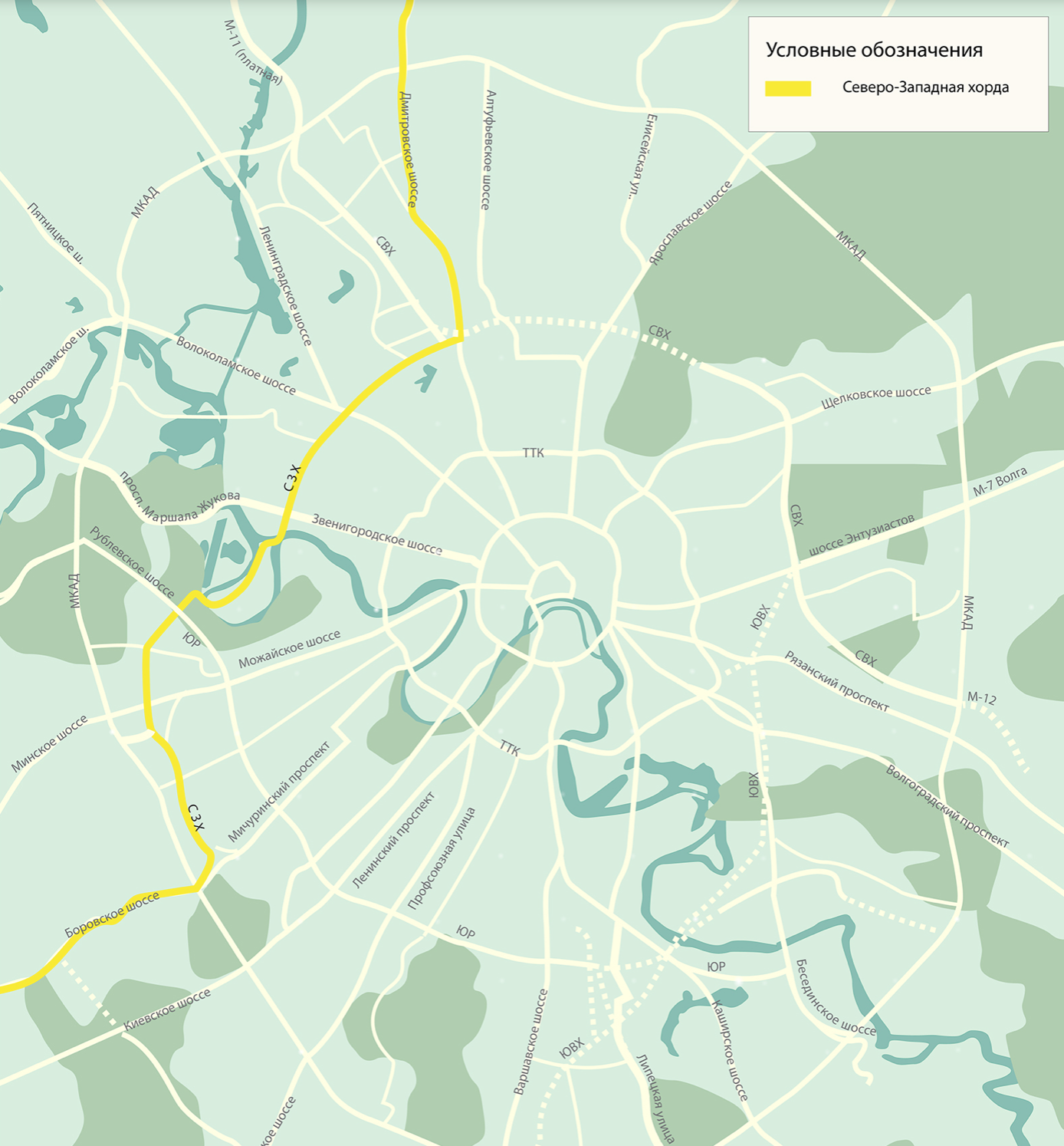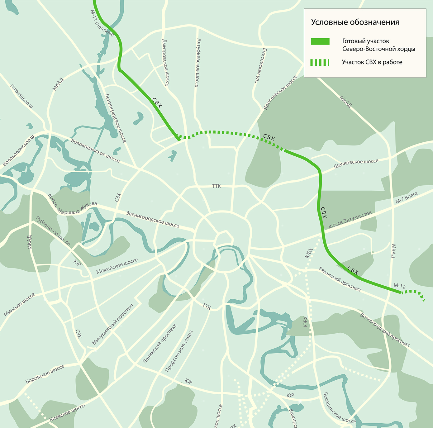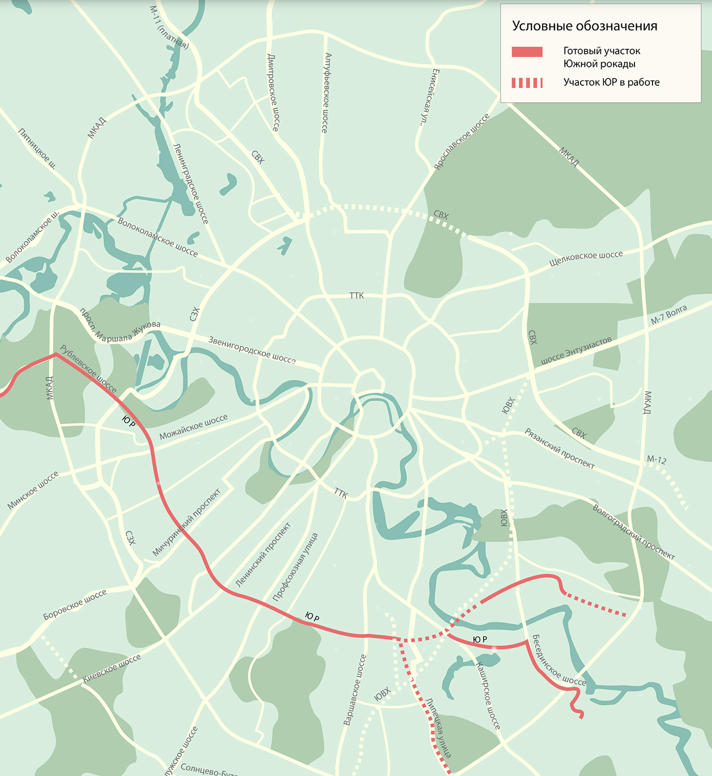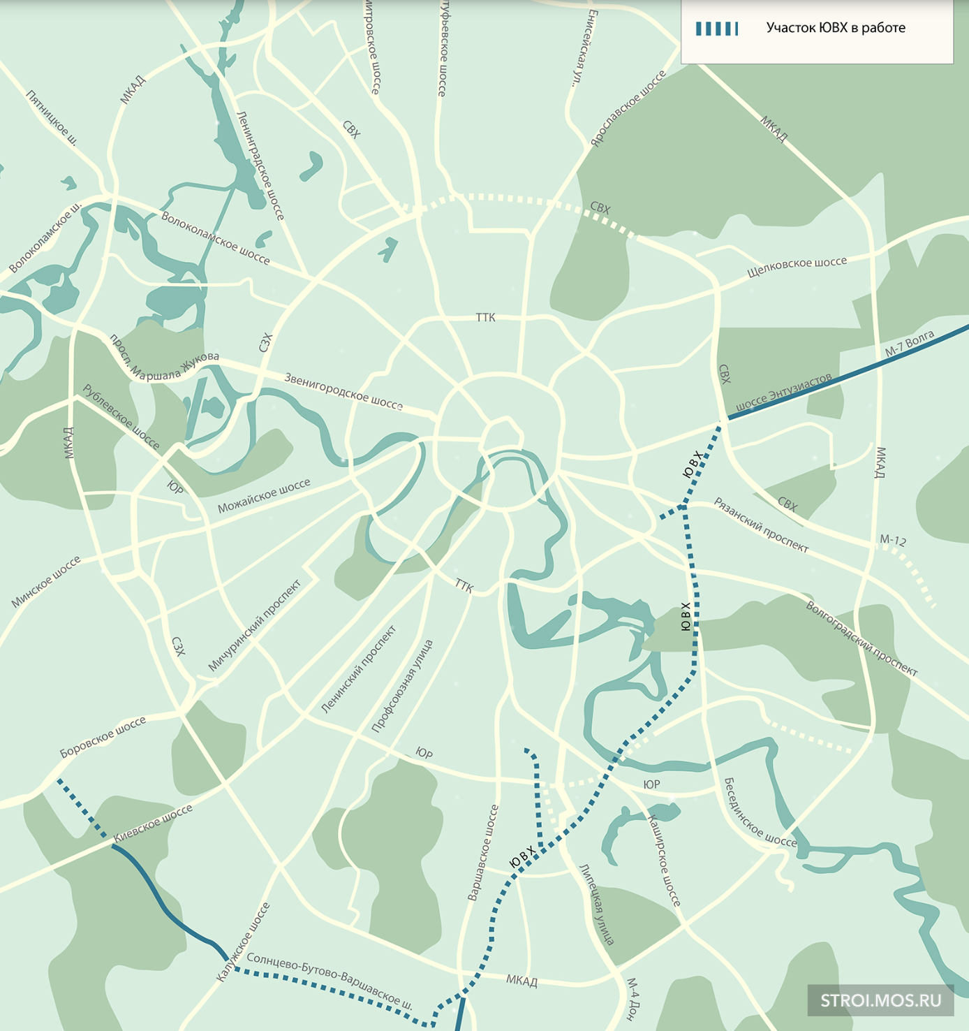 ЮВХ протянется от шоссе Энтузиастов до 35-го километра МКАД, новая трасса улучшит транспортное сообщение 22 районов столицы, в которых проживают более 2 млн человек. По словам главы Стройкомплекса Москвы Андрея Бочкарева, такая система организации движения на 20% эффективнее, чем замкнутая кольцевая.