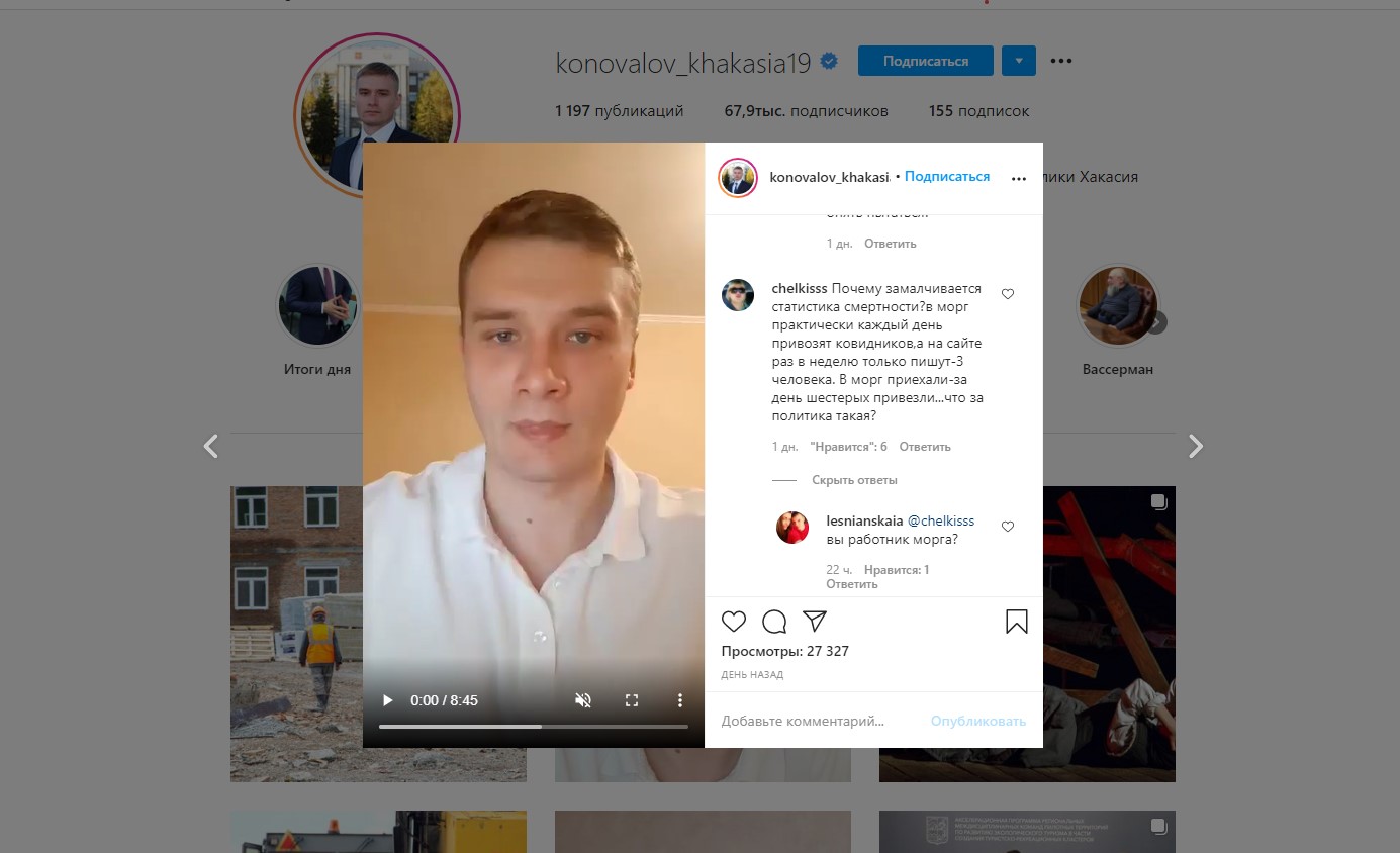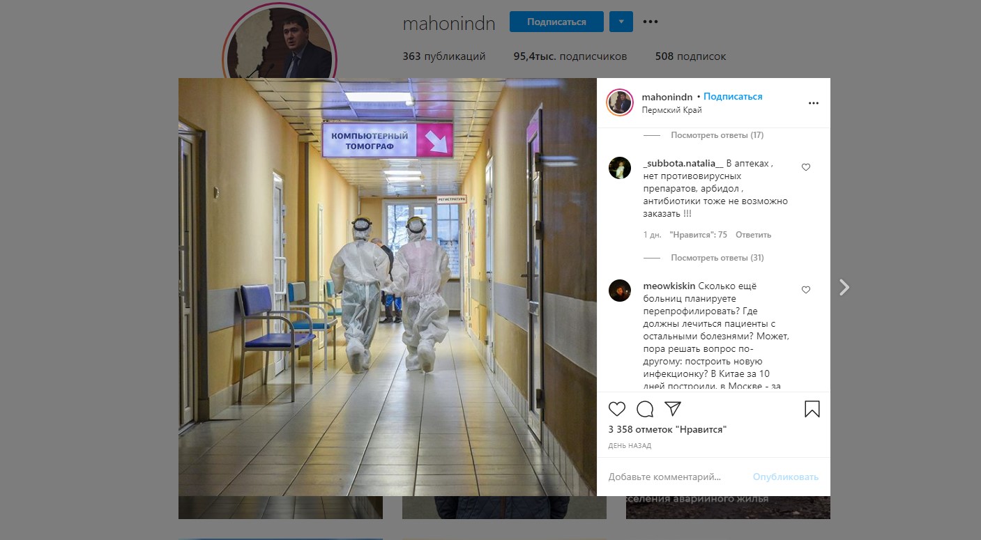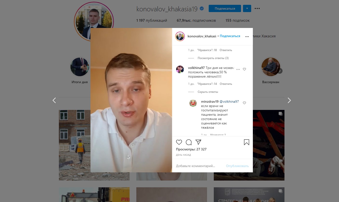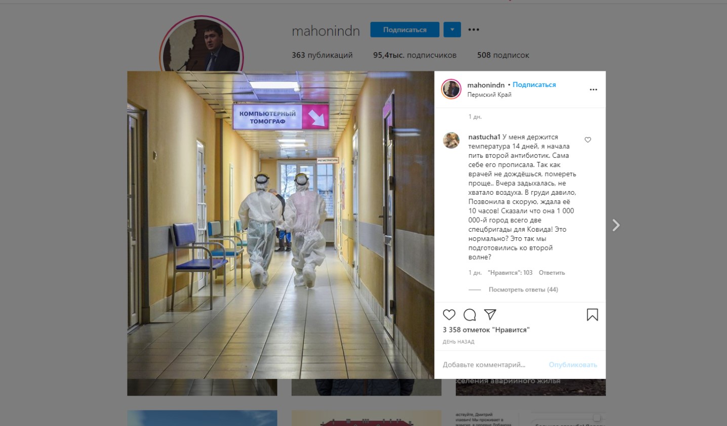 В Instagram самарского губернатора Дмитрия Азарова на сообщения о проблемах в системе здравоохранения сразу же реагирует региональный Минздрав. К слову, жалоб не так много – больше комментариев с пожеланиями скорейшего выздоровления главе региона. 20 октября в сториз Азаров попросил жителей региона задавать вопросы по поводу работы медучреждений региона и принимаемых в области мерах по борьбе с коронавирусом.