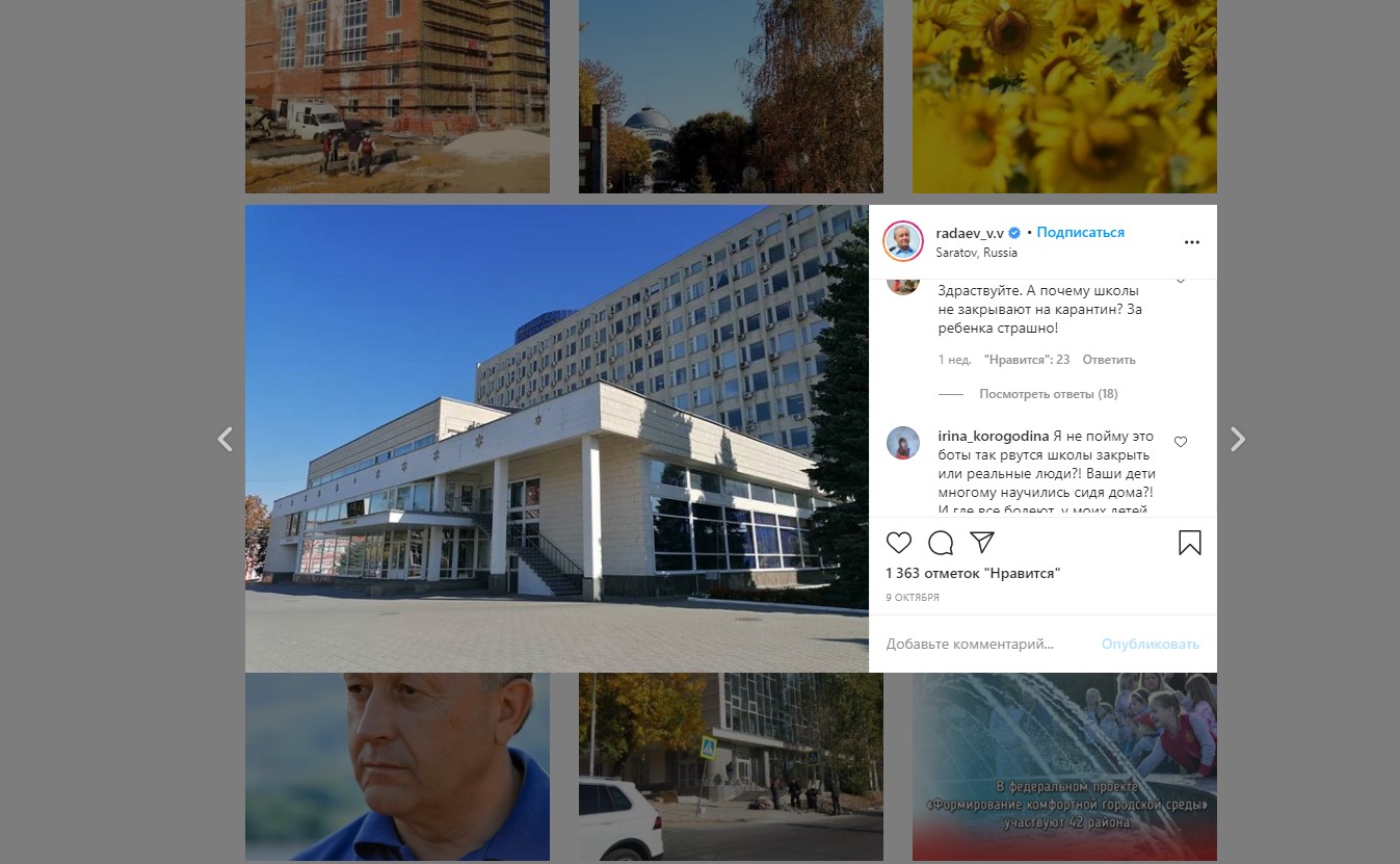 Под этим постом главы региона развернулась дискуссия о том, стоит ли переводить все школы региона на дистанционный формат обучения. Некоторые подписчики требовали закрыть образовательные учреждения на карантин, чтобы остановить распространение коронавируса, другие отмечали, что не все готовы и имеют возможность сидеть дома с ребенком и при этом кормить семью. Некоторые пользователи жаловались на то, что в Саратове пациентов заставляют оплачивать тесты на коронавирус и компьютерную томографию.