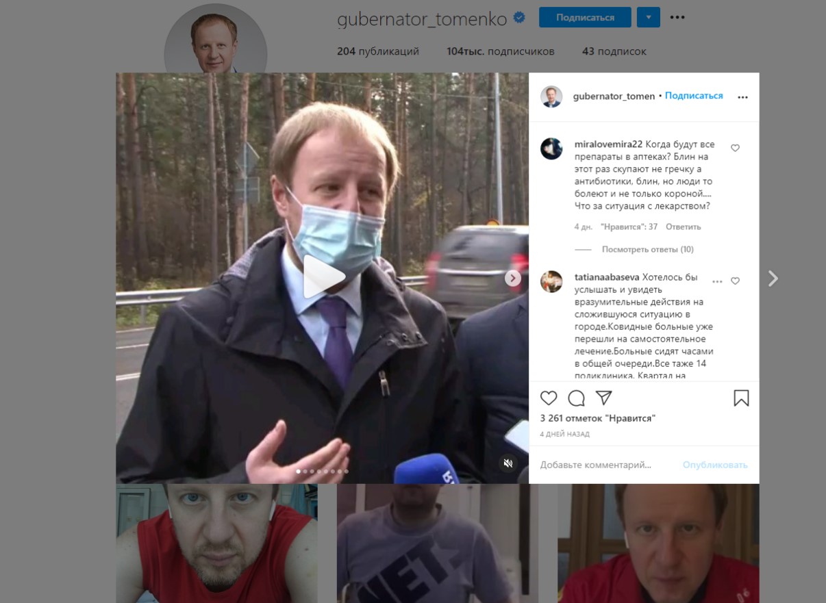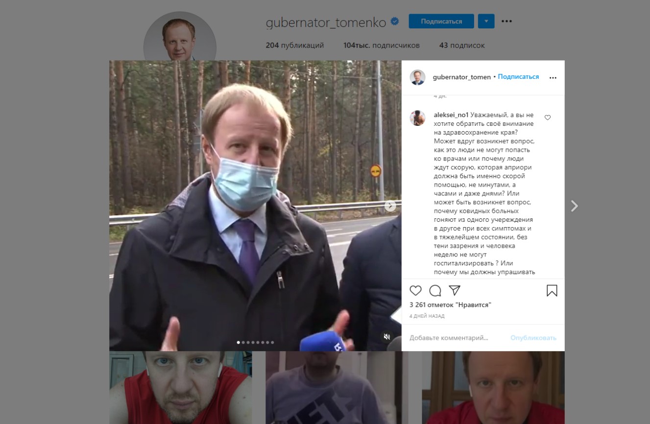 Жители Алтайского края пишут Томенко в Instagram, что вынуждены часами сидеть в очередях, чтобы попасть на прием к врачам, что ждут приезда скорых часами или даже днями, что не могут купить необходимые лекарства в аптеках.