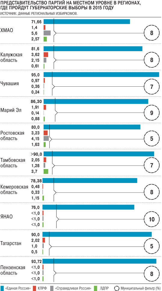 Губернаторские выборы в 2015 году пройдут в 13 регионах: в республиках Чувашия, Марий Эл и Татарстане, в Калужской, Ростовской, Тамбовской, Пензенской, Кемеровской и Калининградской областях, Ханты-Мансийском и Ямало-Ненецком автономных округах, а также в Еврейской автономной области. В Брянской области выборы пройдут досрочно в связи с отставкойгубернатора Николая Денина, но число досрочников может вырасти. В этом году прямые выборы прошли в 30 регионах, в большинстве из них противники действующих врио губернаторов получали помощь от "Единой России", предоставившей подписи конкурентам, так как своих муниципалов им не хватило. Публично о такой поддержке единороссы объявили в Астраханской, Кировской, Курской и Волгоградской областях. В Санкт-Петербурге партия власти не стала помогать кандидату от "Справедливой России" Оксане Дмитриевой. В 2015 году, по данным "Ъ", ни одна парламентская партия, кроме "Единой России", также не сможет обеспечить своему кандидату самостоятельное преодоление муниципального фильтра.